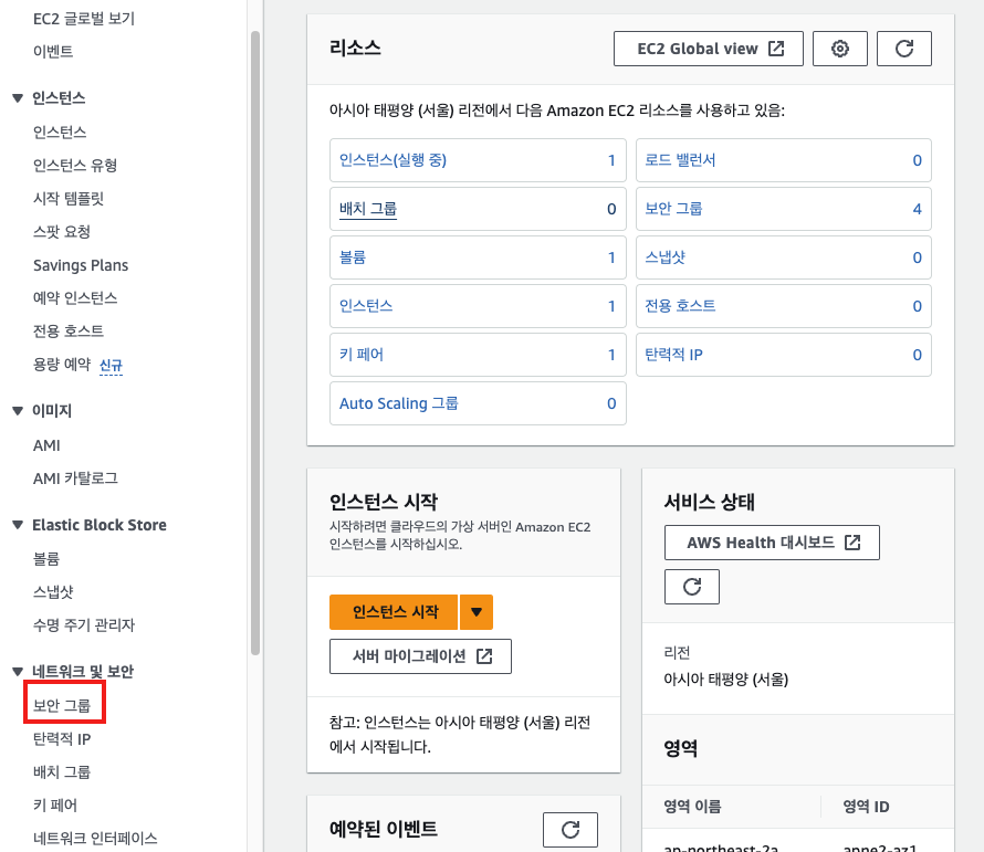 새로운 AWS 창을 띄우고 EC2 들어간 뒤 보안 그룹 생성