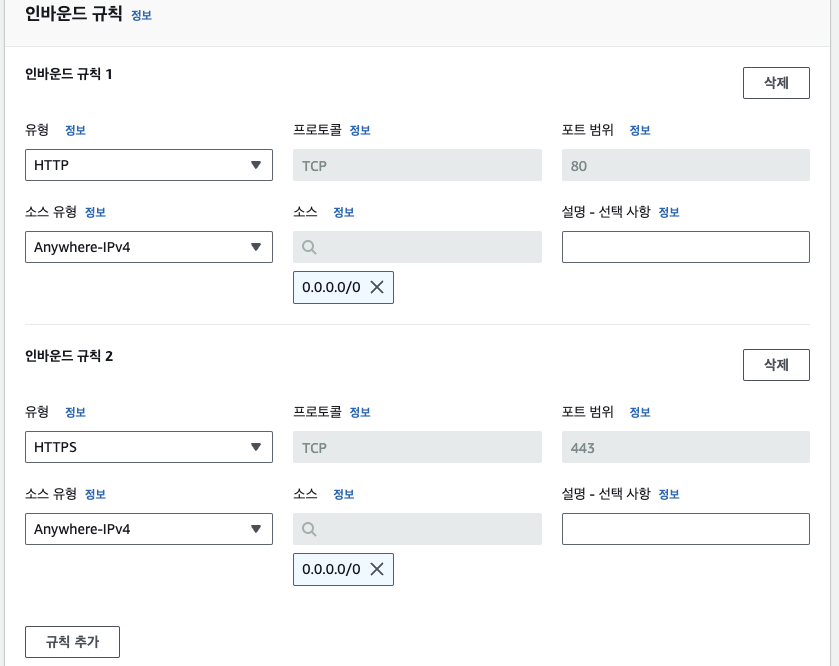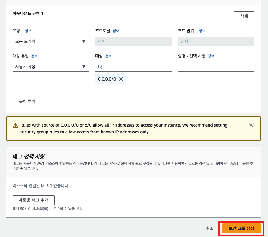 설명을 입력하지 않으면 보안그룹 생성이 안되므로, 입력해주기.