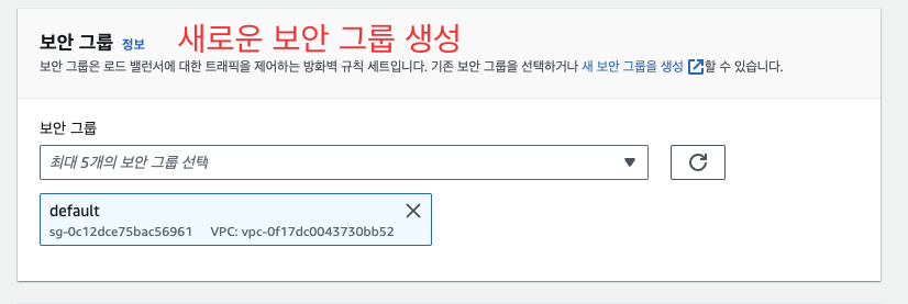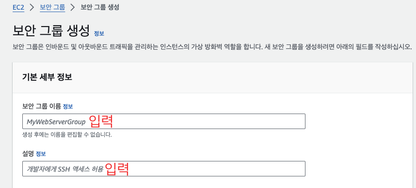 설명을 입력하지 않으면 보안그룹 생성이 안되므로, 입력해주기.