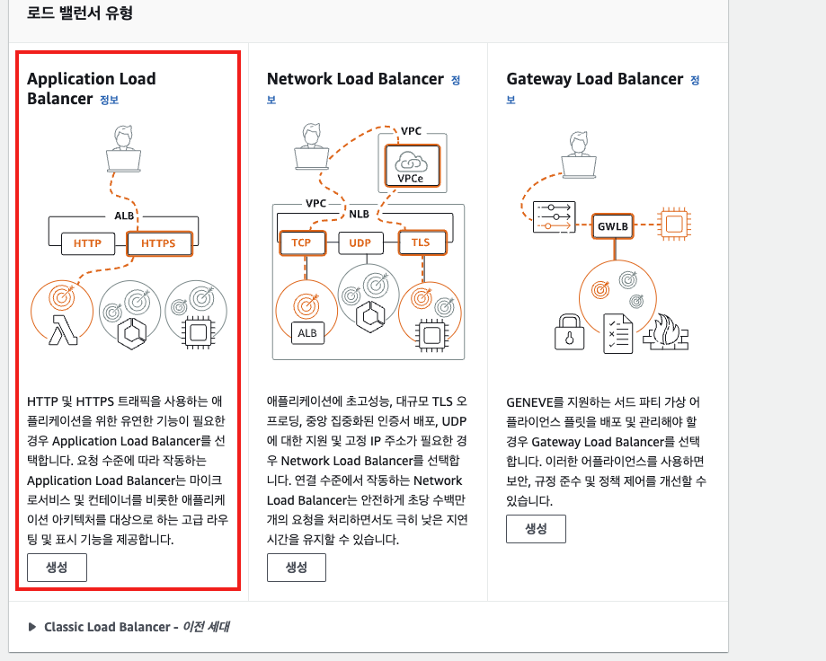 - 우린 http/https를 사용할 것이므로 Application Load Balancer 클릭.\