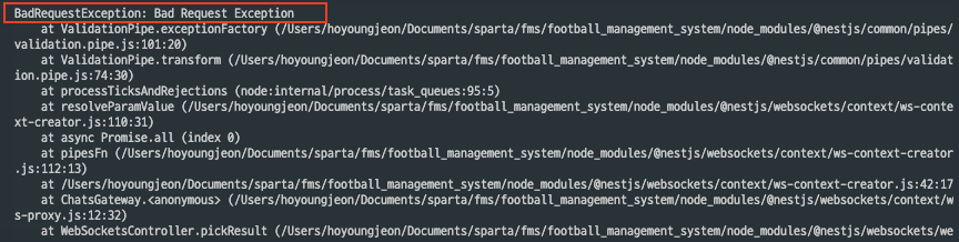 우리가 보고싶은 에러는 Websocket에러인데, HttpException을 상속받는 Bad Request Exception을 던지고 있다.