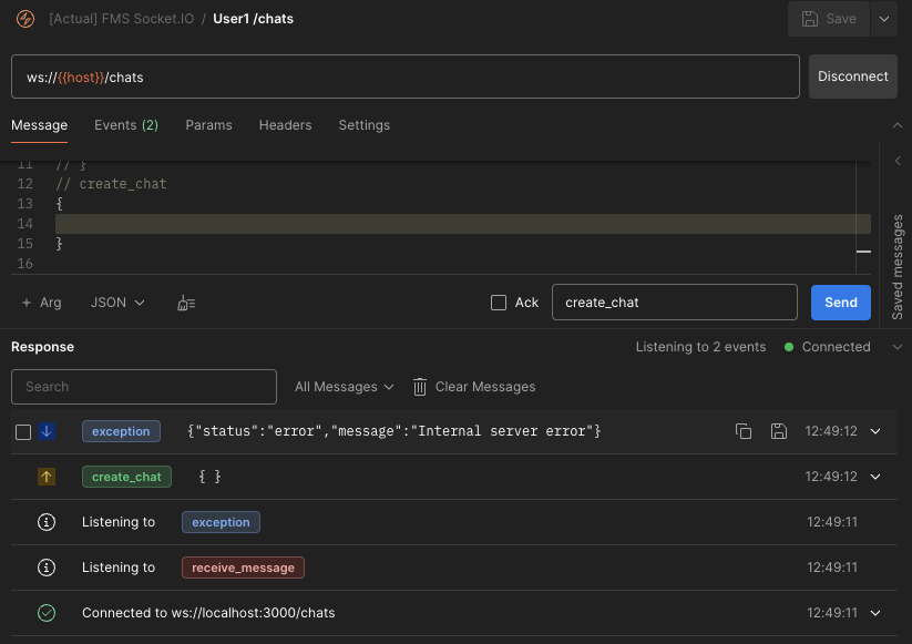 문제상황은 Websocket에서 createChat() 이벤트를 실행하던 도중 발생했다.
