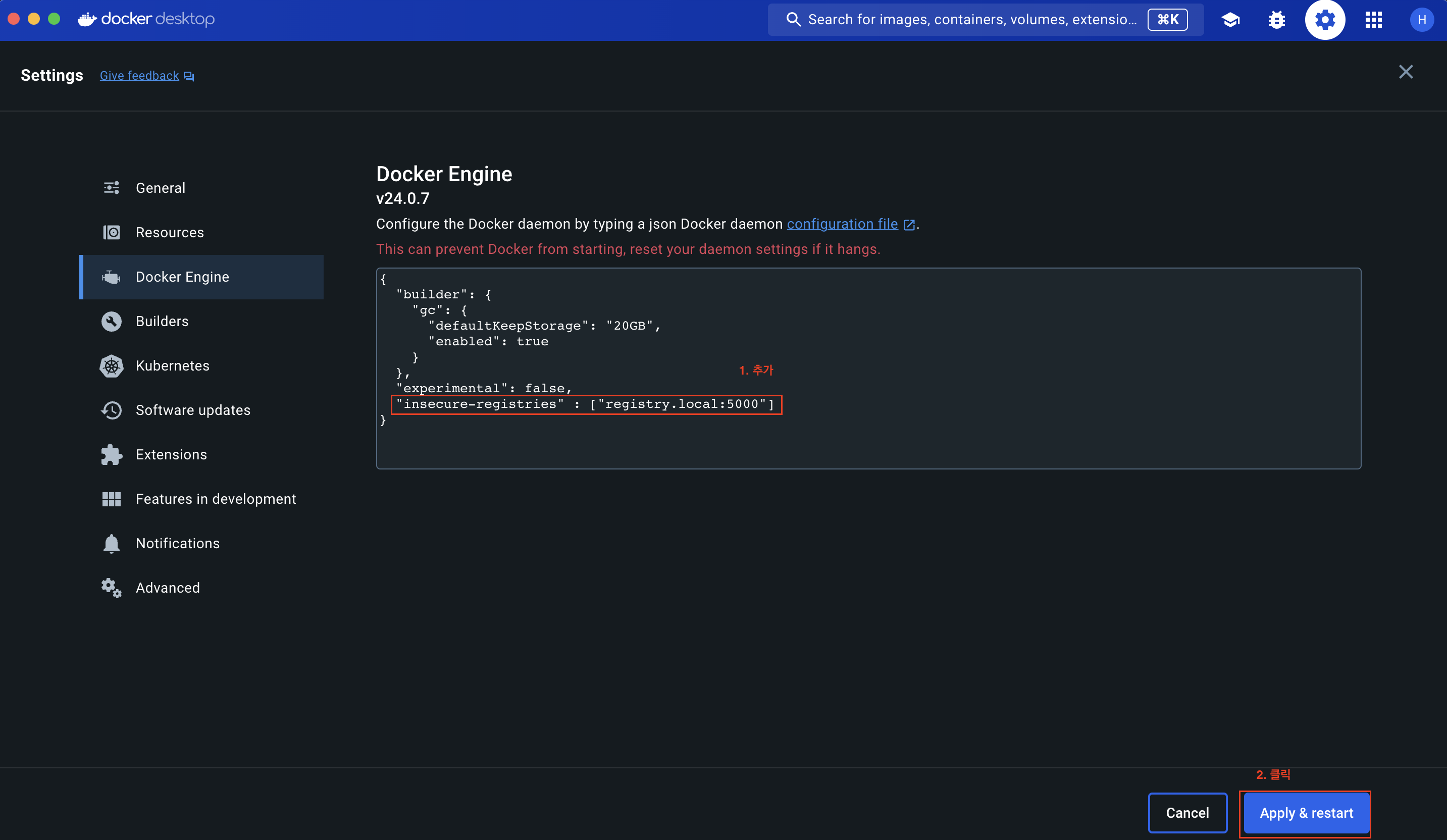 도커의 기본 설정에선 비보안 프로토콜이 적용된 레지스트리를 사용할 수 없게 되어있으므로, 비보안 레지스트리를 사용하려면 로컬 컴퓨터의 레지스트리를 비보안 레지스트리의 허용 목록에 추가해야 함
