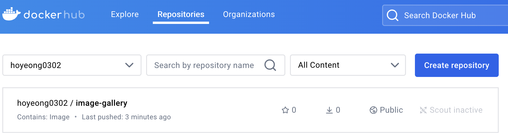 로그인이 됐으면 본인의 계정 또는 푸시 권한이 부여된 단체 계정에 이미지를 푸시할 수 있음.