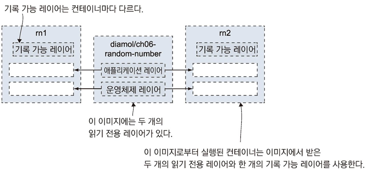 이 출처는 기본적으로 이미지 레이어와 컨테이너의 기록 가능(read/write) 레이어로 구성되는데, 이미지 레이어는 모든 컨테이너가 공유하지만 기록 가능 레이어는 컨테이너마다 다르다.