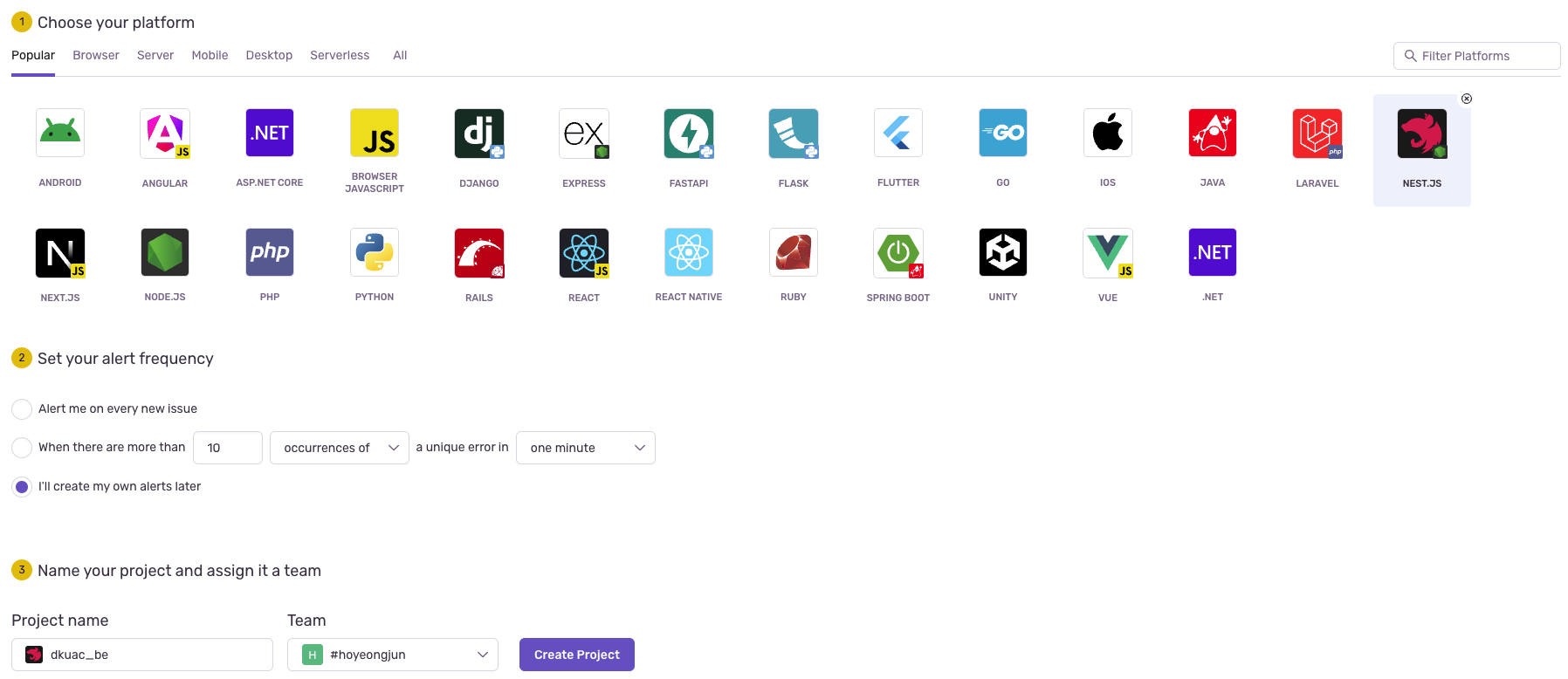3. Sentry 프로젝트 생성