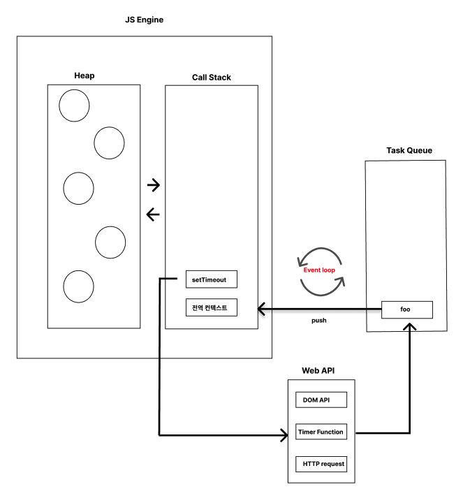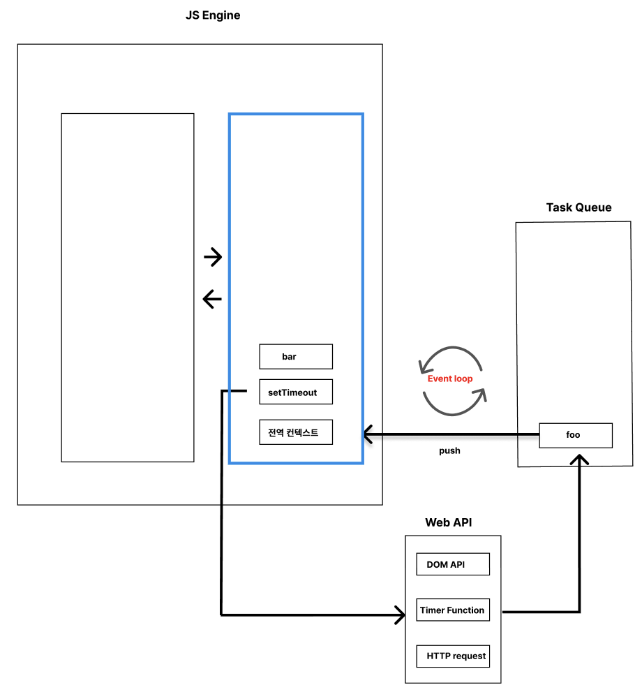 여기서 setTimeout은 비동기 함수이므로, 무조건 WebAPI로 가서 setTimeout 함수를 실행시킨 뒤, 콜백 함수인 foo 함수를 Task Queue로 보낸다.