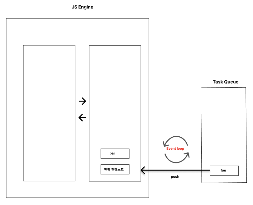 TaskQueue에 있는 함수는 콜 스택의 실행 컨텍스트가 있는 경우 , 실행 컨텍스트가 다 사라지기 전까진, 콜 스택으로 push될 수 없기에 bar가 실행된 뒤에 foo가 실행 되는 것이다!