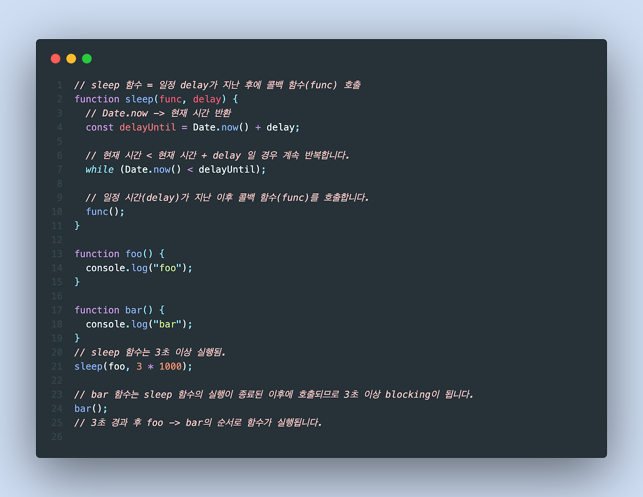 bar함수는 [처음 3초 + foo 실행시간] 이 지난 후 실행이 된다.