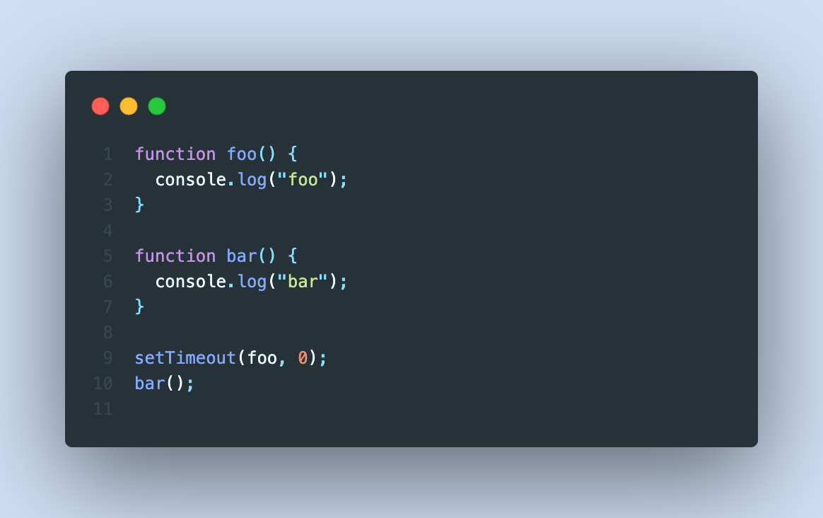 setTimeout의 delay가 0초이므로, 바로 foo()가 실행된 뒤 bar()가 실행될까?