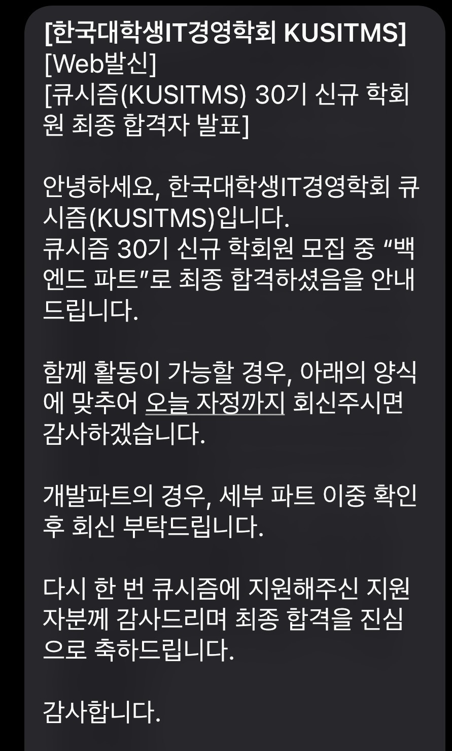 사실 목요일 오후까지 연락이 없어서 떨어진줄 알았다...