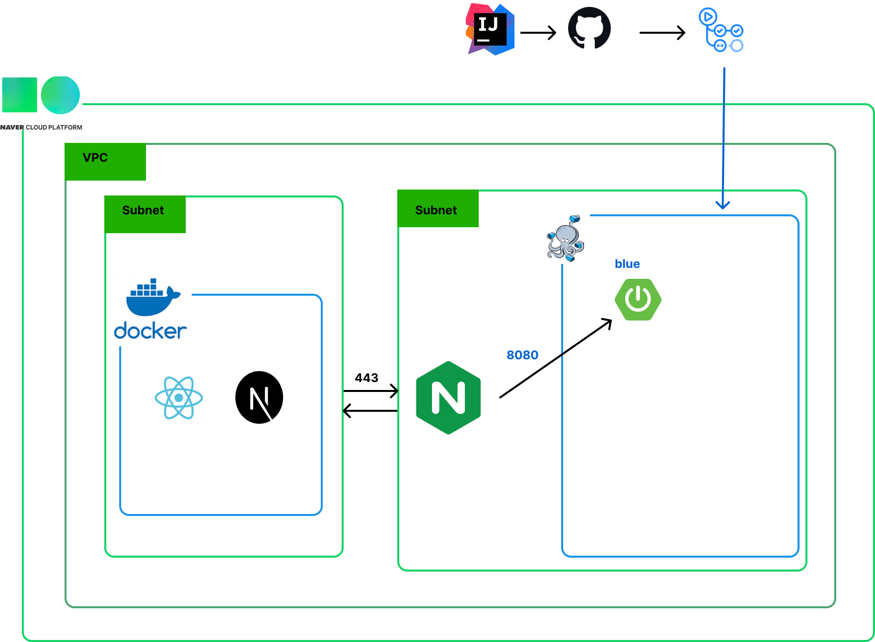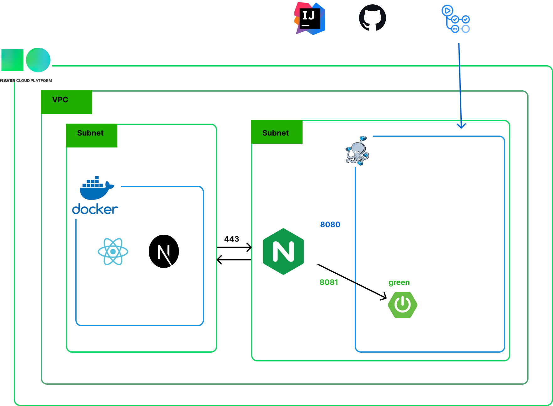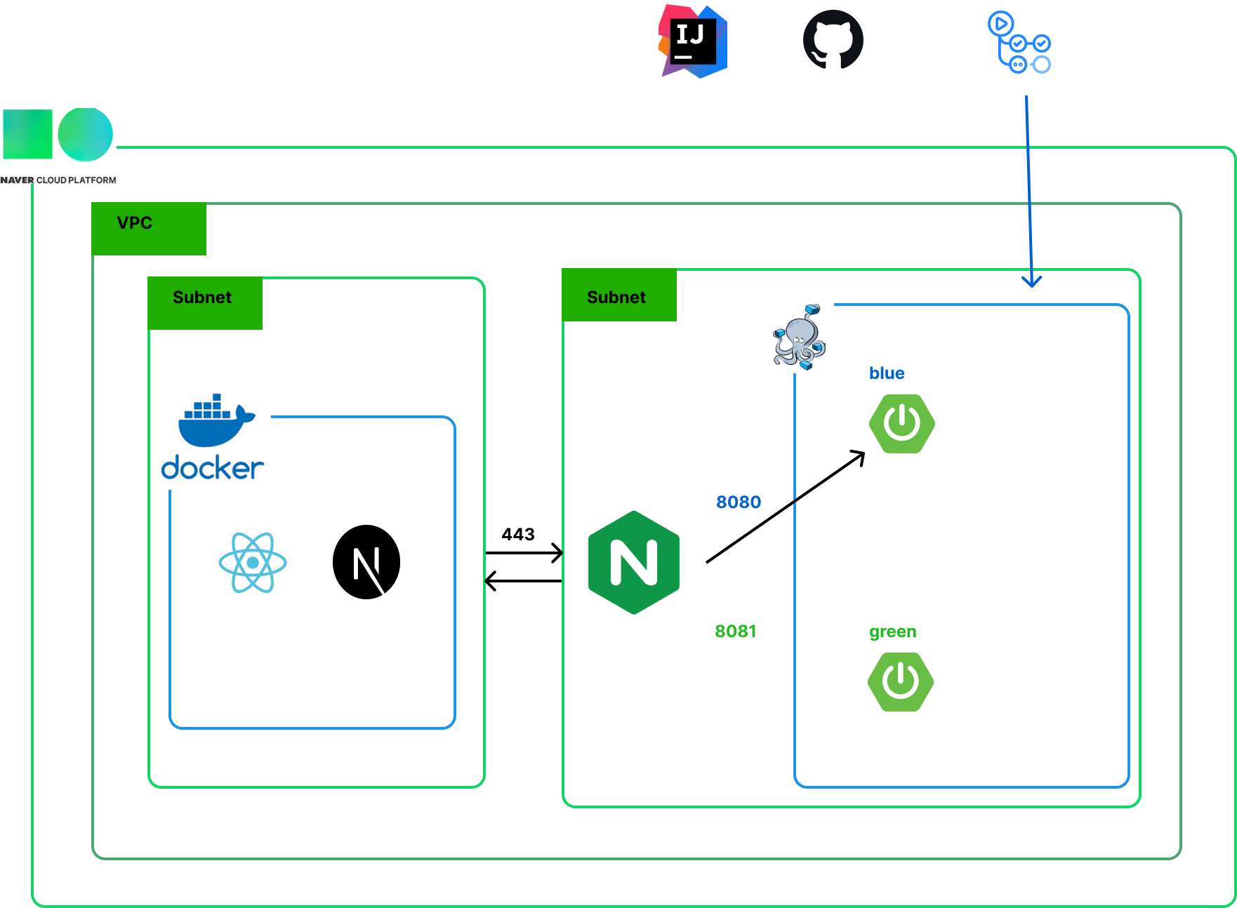 blue 라면 green을 사용할 예정이고, green이라면 blue를 새 환경으로 사용할 준비를 한다.