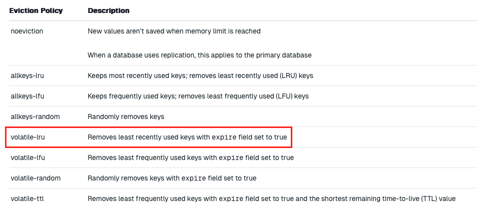 volatile-lru는 expire가 true인 값 중 최근에 가장 덜 사용된 키를 삭제하는 것이다.