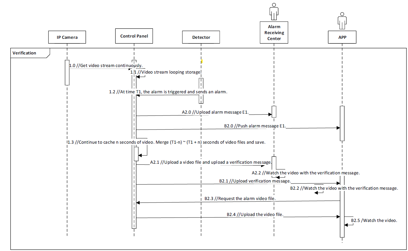 알람이 T초에 울림(사건발생) -> signal 이 Control Panel로 전송됨 -> Control panel이 알람 기록 후 알람 수신 센터와 모바일 클라이언트에게 알람 전송. + 동시에 Control Panel이 T - n ~ T + n 초 비디오를 알람 수신 센터와 모바일 클라이언트에게 전송.