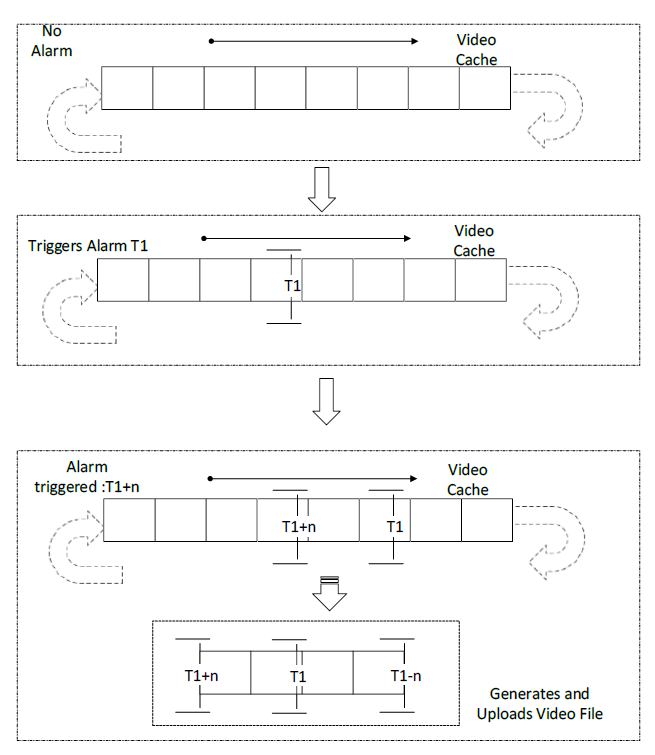 T1에 알람 발생(침입 탐지 시) T1 +- n초 비디오 생성하고 업로드.