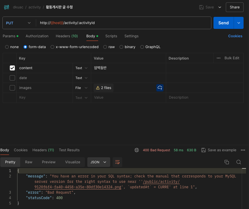 이미 업로드한 사진은 그대로 두고, 다른 내용을 수정하려할 때 에러가 발생했습니다.