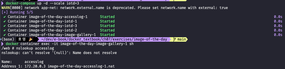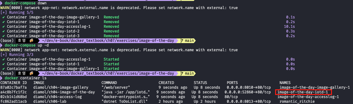 --scale을 통해 iotd를 3개로 스케일 아웃 했었다. 그러나 도커 컴포즈 파일엔 스케일 아웃에 대한 정의가 없으므로 재시작시 세개로 늘렸던 컨테이너 수가 다시 하나로 돌아간다.