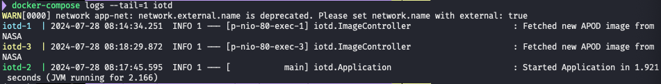 docker-compose logs --tail=1 iotd
